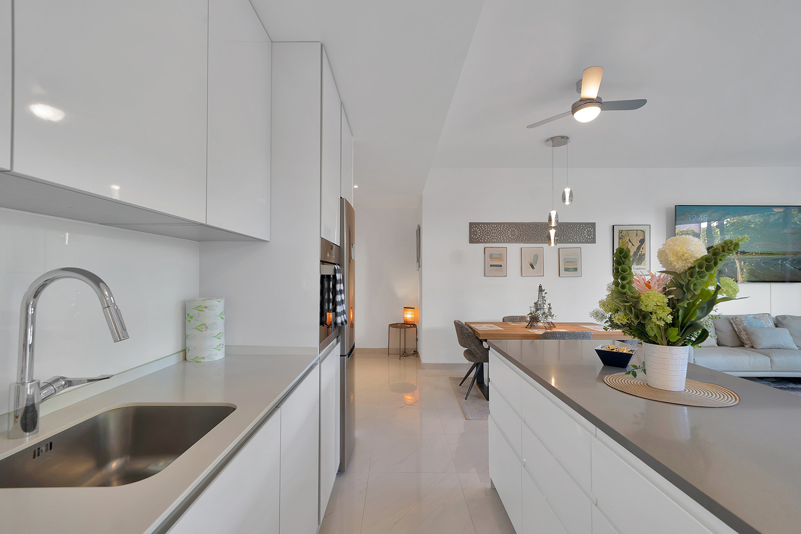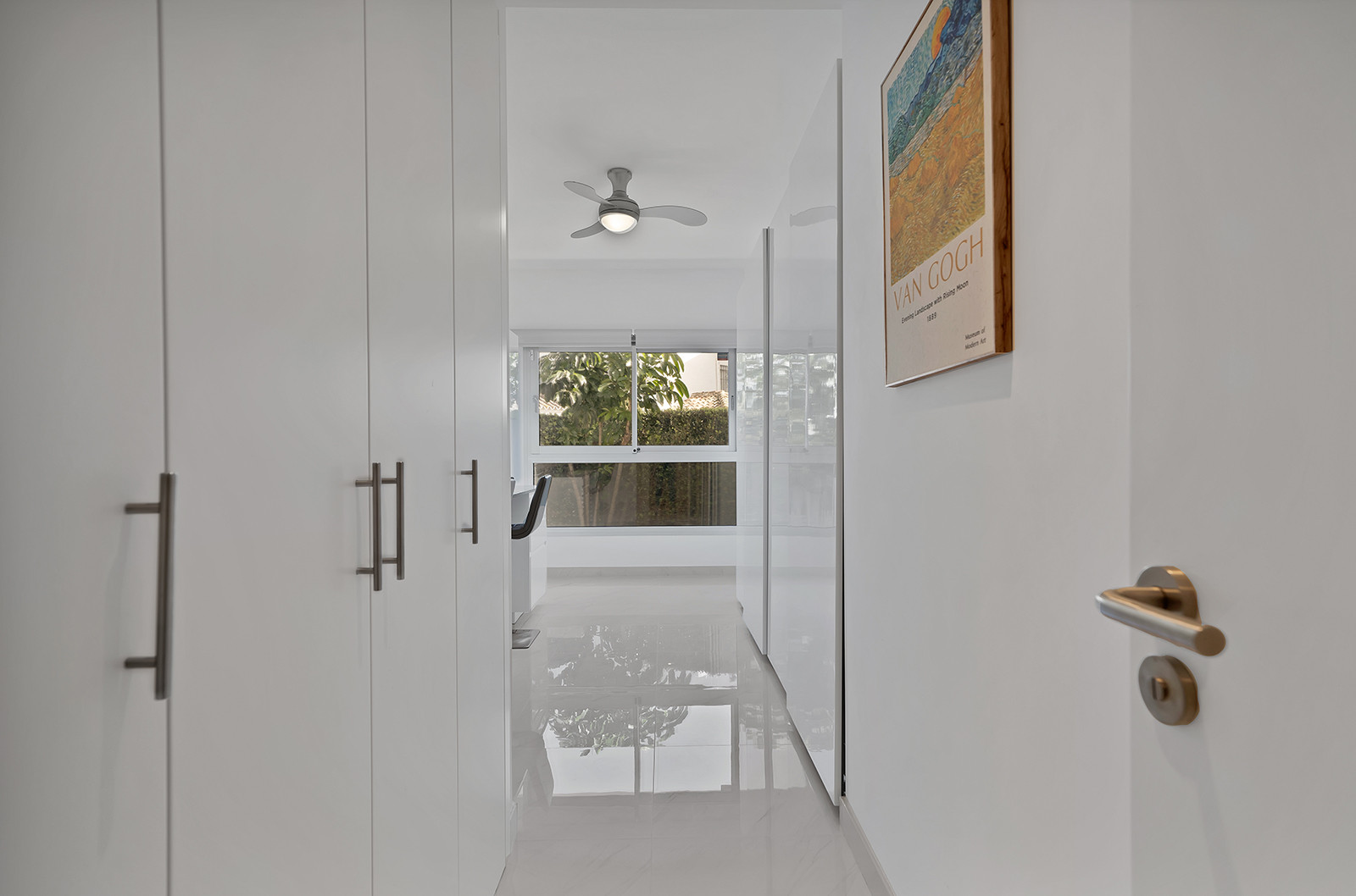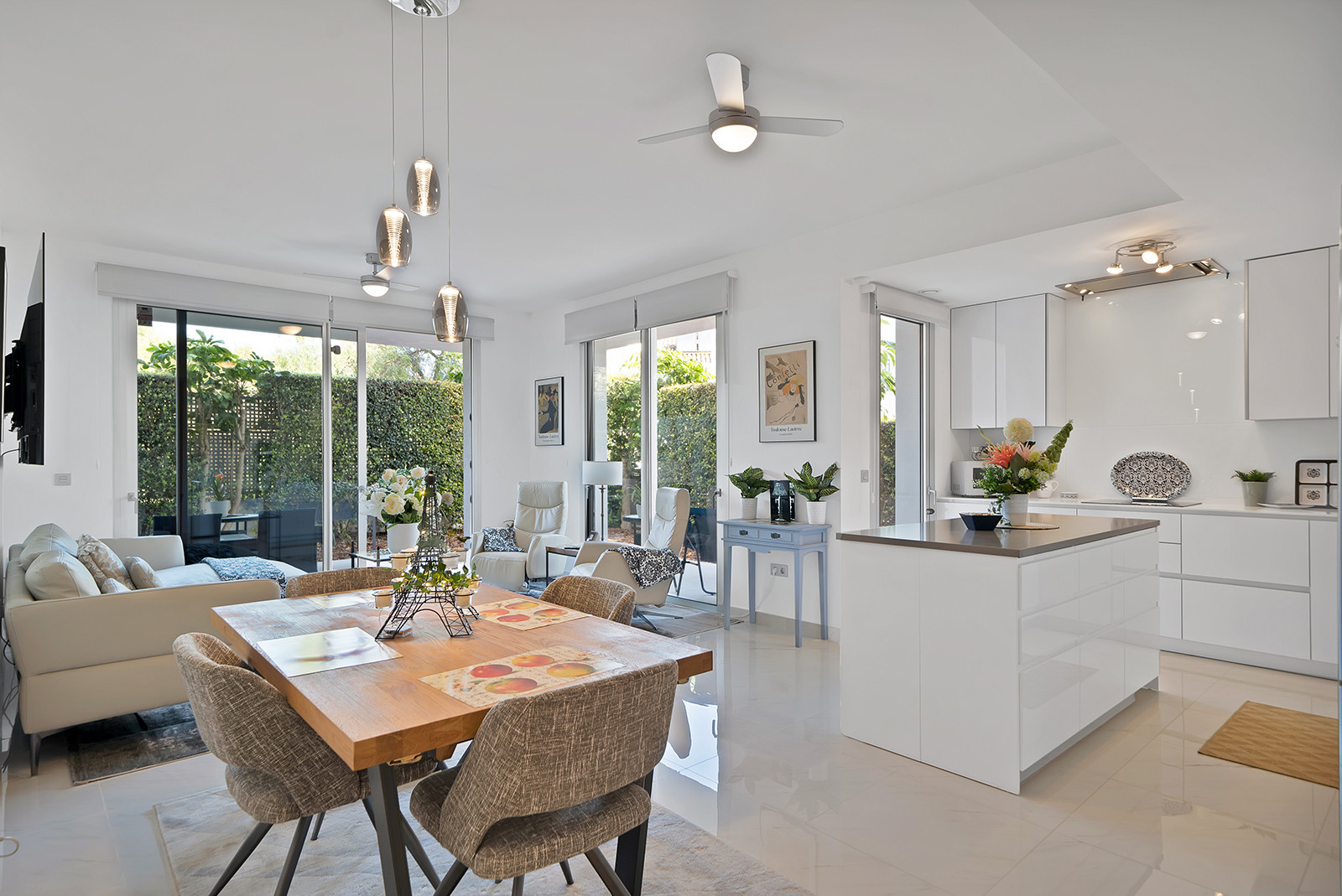 Los interiores presentan un diseño contemporáneo de planta abierta, con una cocina a medida que cuenta con una impresionante isla central con encimeras de cuarzo y electrodomésticos de alta gama totalmente integrados. Cada elemento ha sido cuidadosamente seleccionado, desde los materiales de alta gama hasta los avanzados sistemas de climatización, calefacción y purificación de aire, complementados con ventiladores de techo para garantizar la comodidad durante todo el año.