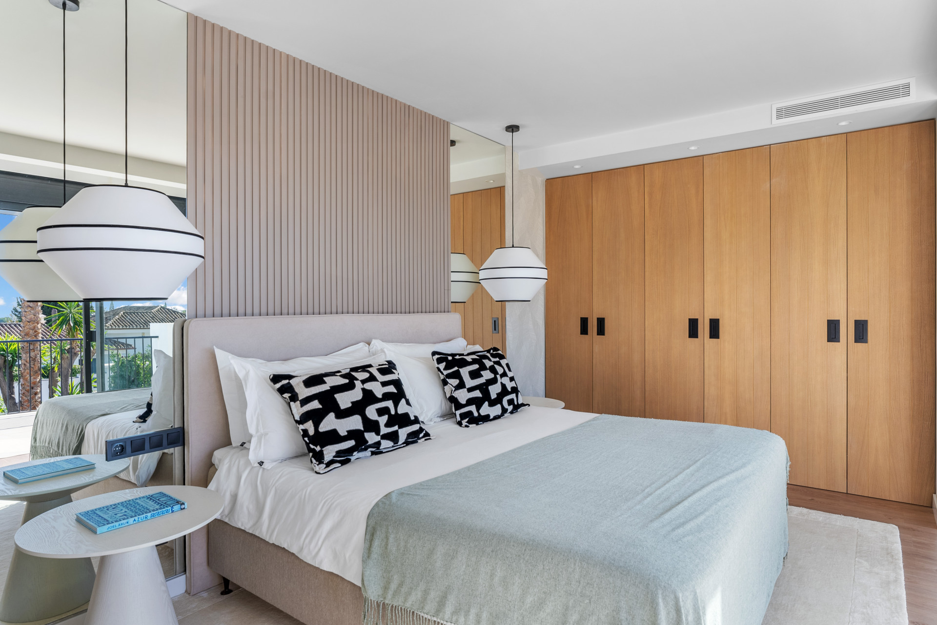 Esta excepcional villa de inspiración escandinava se encuentra idealmente ubicada en el corazón de Nueva Andalucía, a tan solo 300 metros del campo de golf Los Naranjos. Diseñada para maximizar la luz y la amplitud, la vivienda cuenta con un espacio de salón de concepto abierto con techos de doble altura, grandes ventanales de suelo a techo, una acogedora chimenea y una cocina de diseño contemporáneo equipada con electrodomésticos Miele de alta gama.