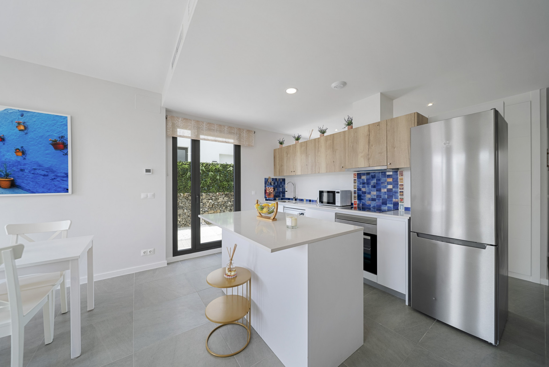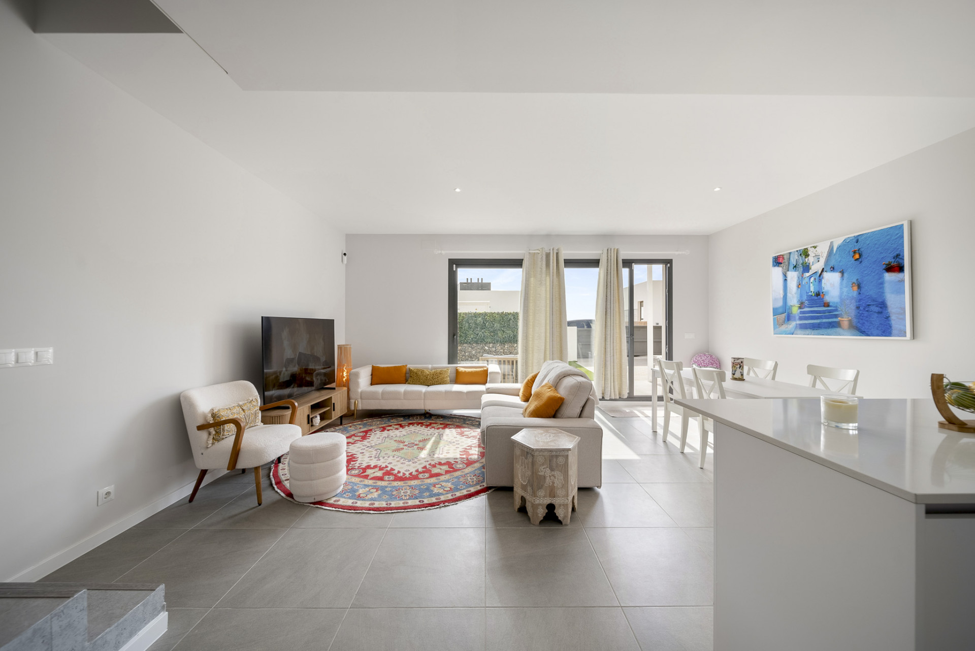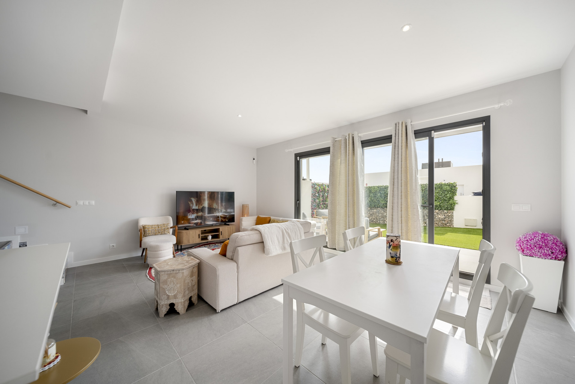 La propiedad cuenta con interiores diáfanos con una estética fresca y moderna, donde los grandes ventanales llenan los espacios de luz natural y crean una conexión perfecta entre la vida interior y exterior. La amplia sala de estar y el comedor dan directamente a un jardín privado, lo que ofrece el espacio ideal para relajarse, entretenerse o disfrutar del clima mediterráneo con la familia y los amigos.