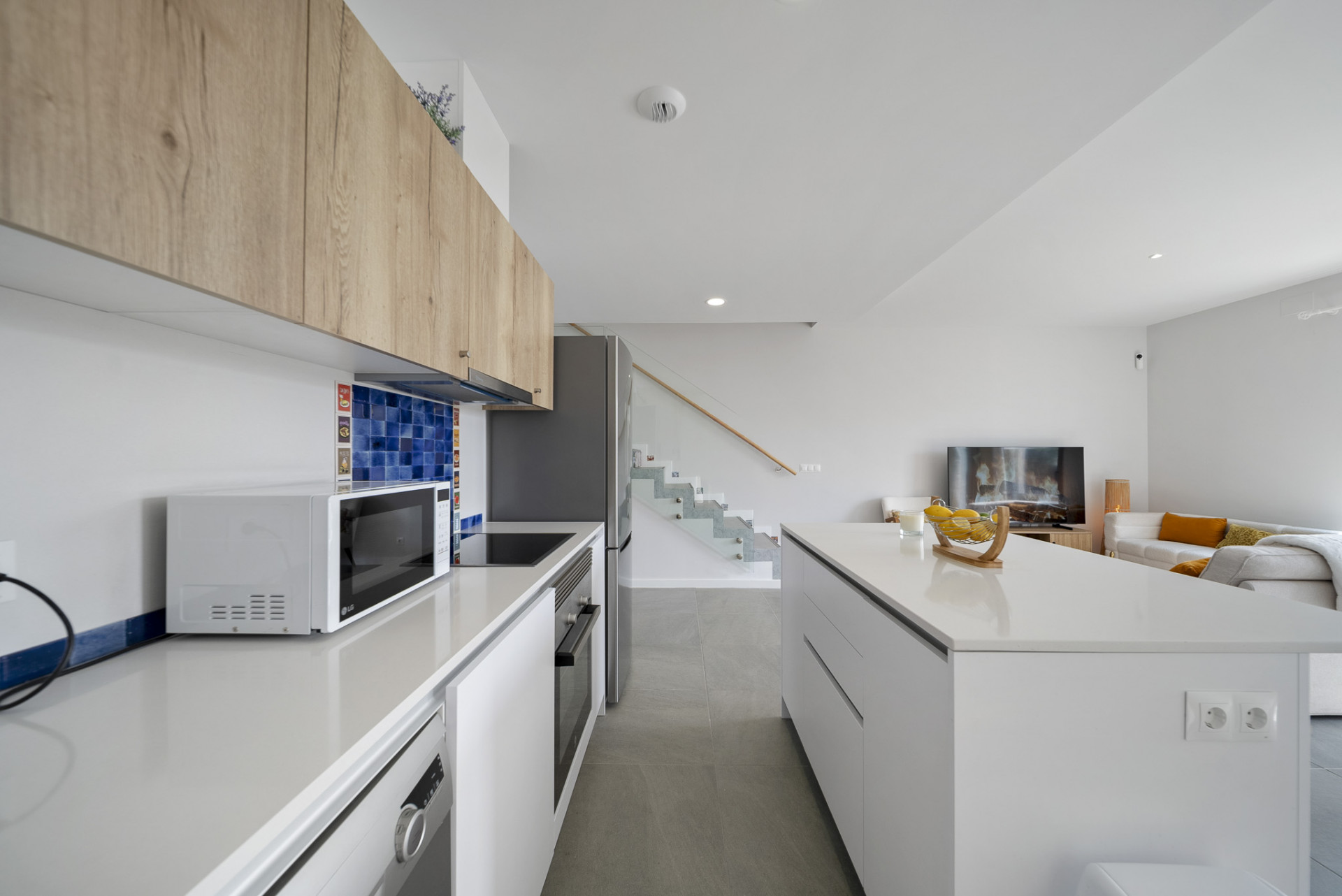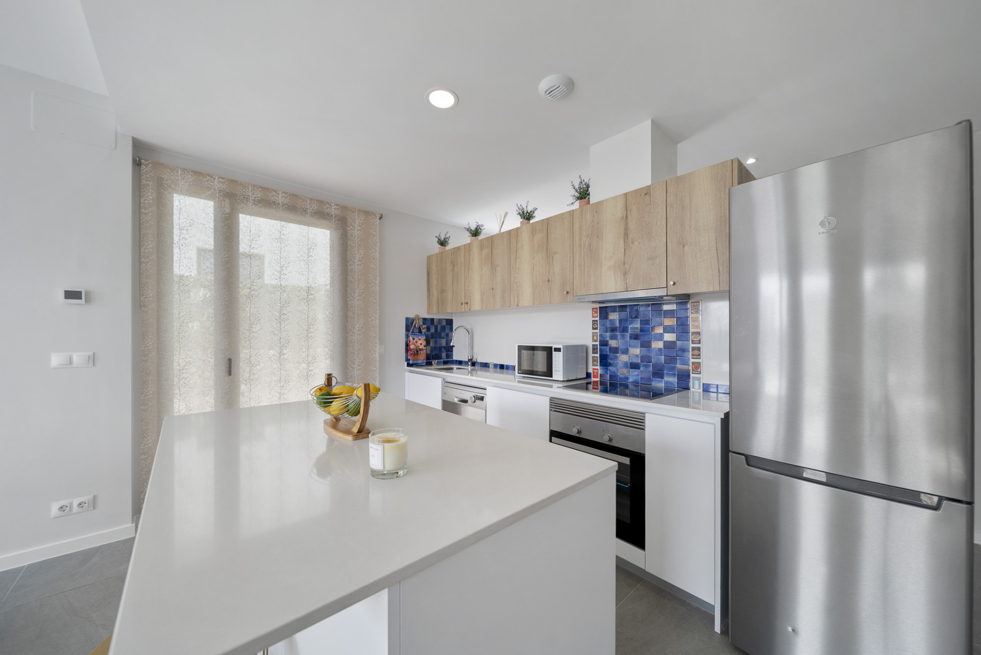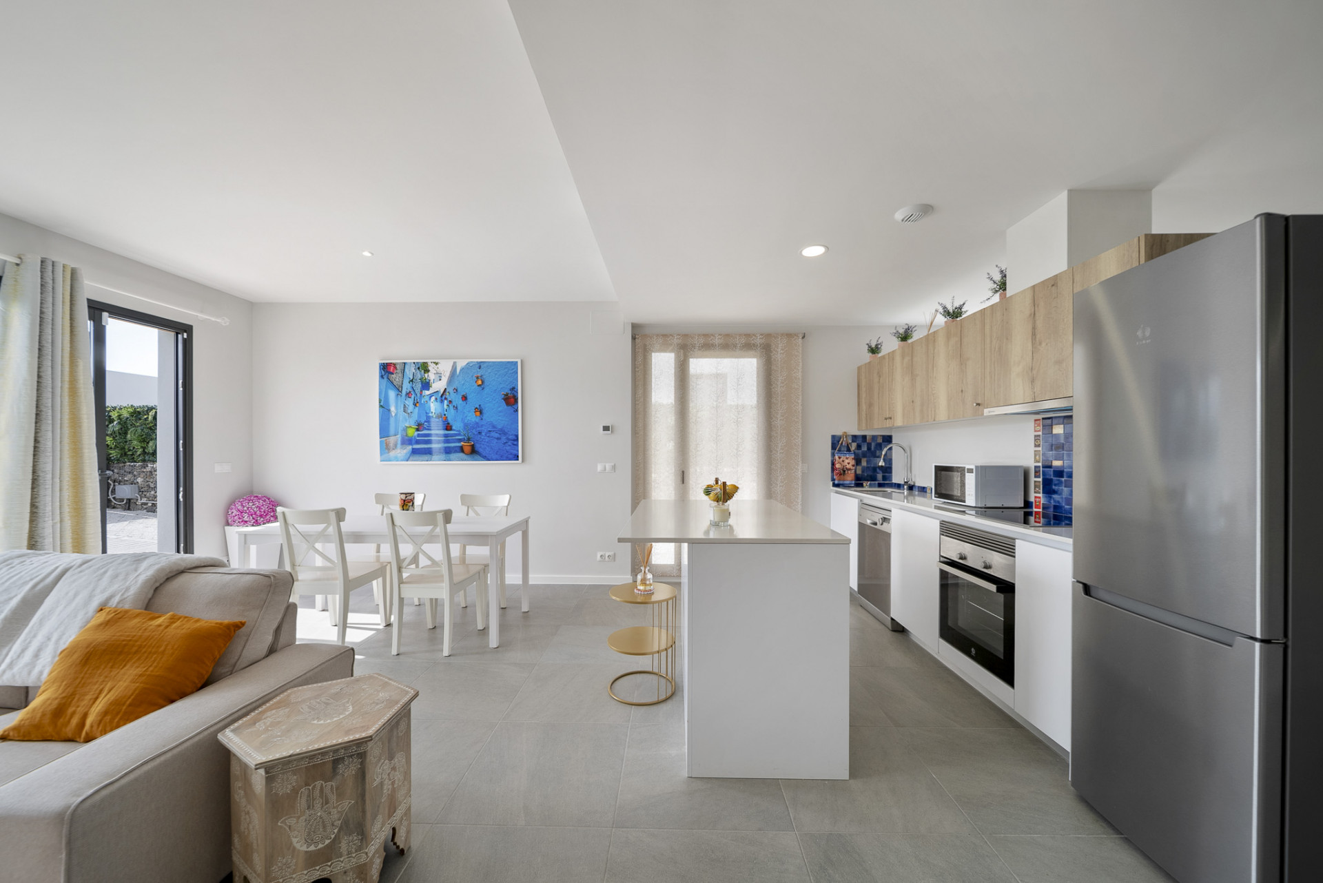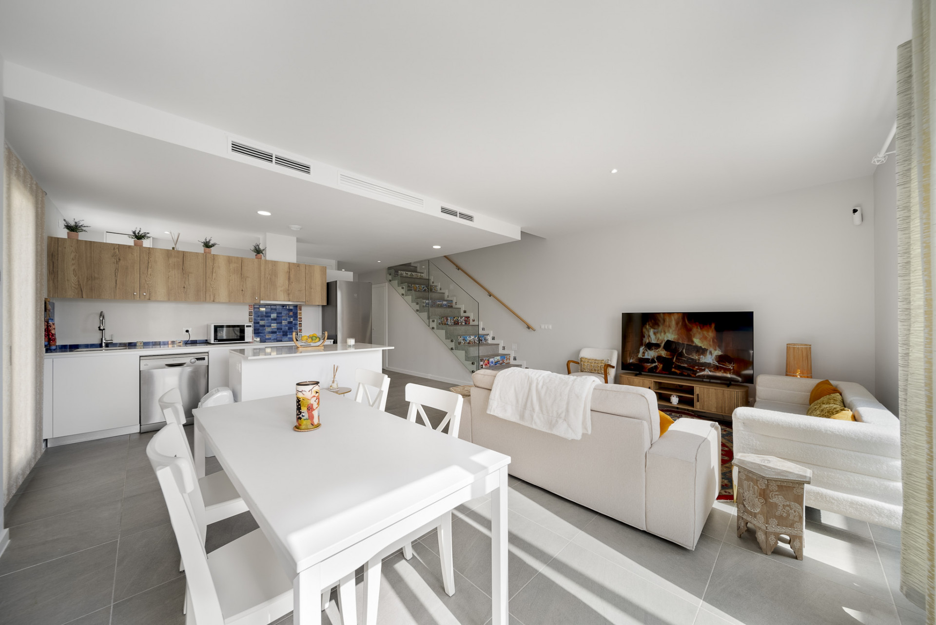 La propiedad cuenta con interiores diáfanos con una estética fresca y moderna, donde los grandes ventanales llenan los espacios de luz natural y crean una conexión perfecta entre la vida interior y exterior. La amplia sala de estar y el comedor dan directamente a un jardín privado, lo que ofrece el espacio ideal para relajarse, entretenerse o disfrutar del clima mediterráneo con la familia y los amigos.