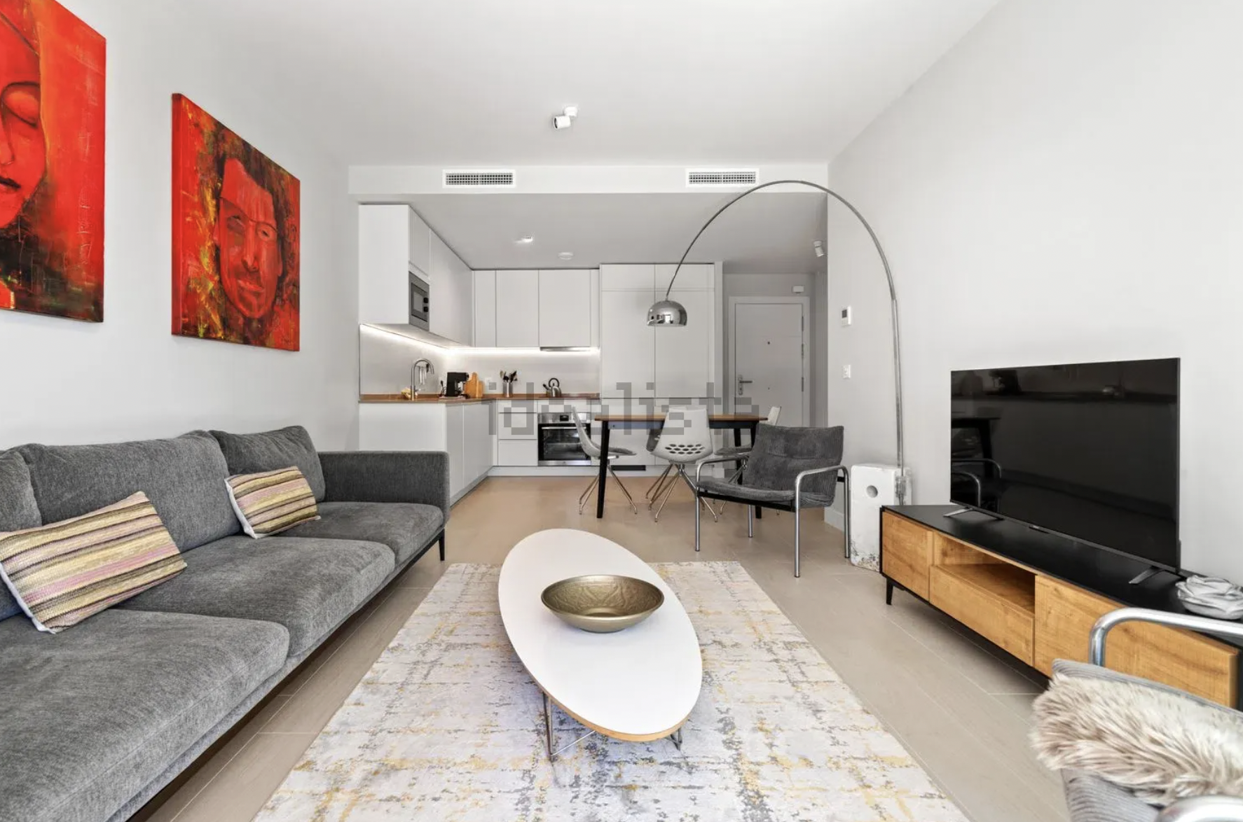 The apartment features a stylish open-plan kitchen and living area, designed to maximize space and natural light. Floor-to-ceiling windows open directly onto a spacious private terrace (35 m²) and garden (24 m²), creating a seamless indoor–outdoor lifestyle ideal for enjoying the Mediterranean climate.