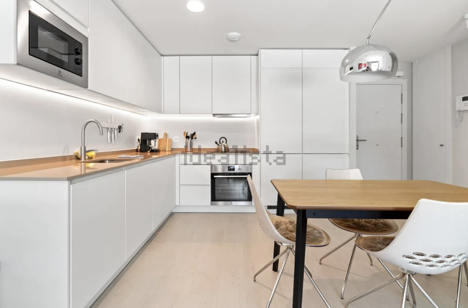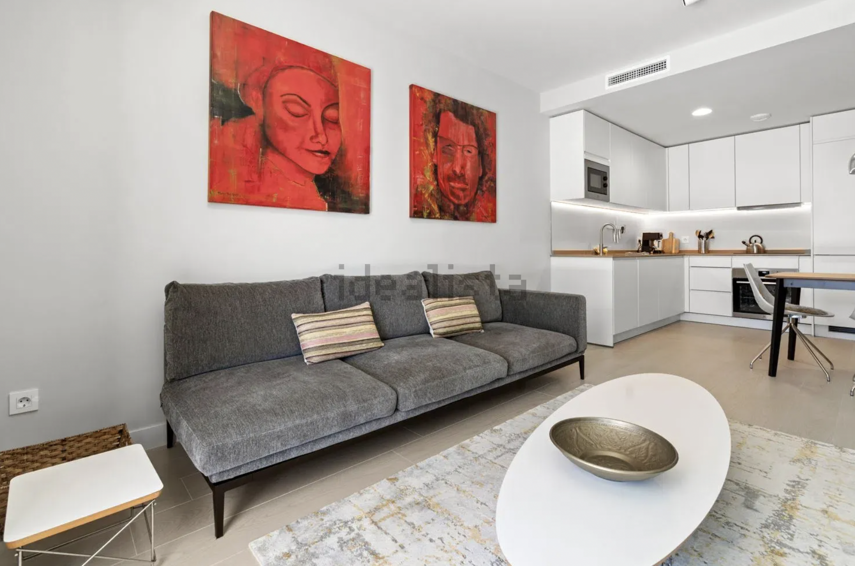 The fully equipped modern kitchen is both sleek and functional, while the living area provides a comfortable and relaxing space with a sofa and flat-screen TV.