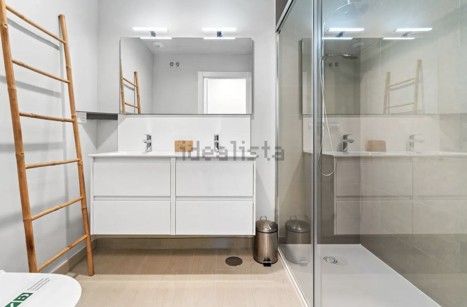 The property includes two well-appointed bedrooms, both furnished with twin beds. The master bedroom offers generous storage and an en-suite bathroom with double sinks and a walk-in shower. The second bedroom also has direct access to the terrace and is served by a second modern bathroom with a walk-in shower. Both bedrooms enjoy pleasant views of the surrounding countryside and the sea.