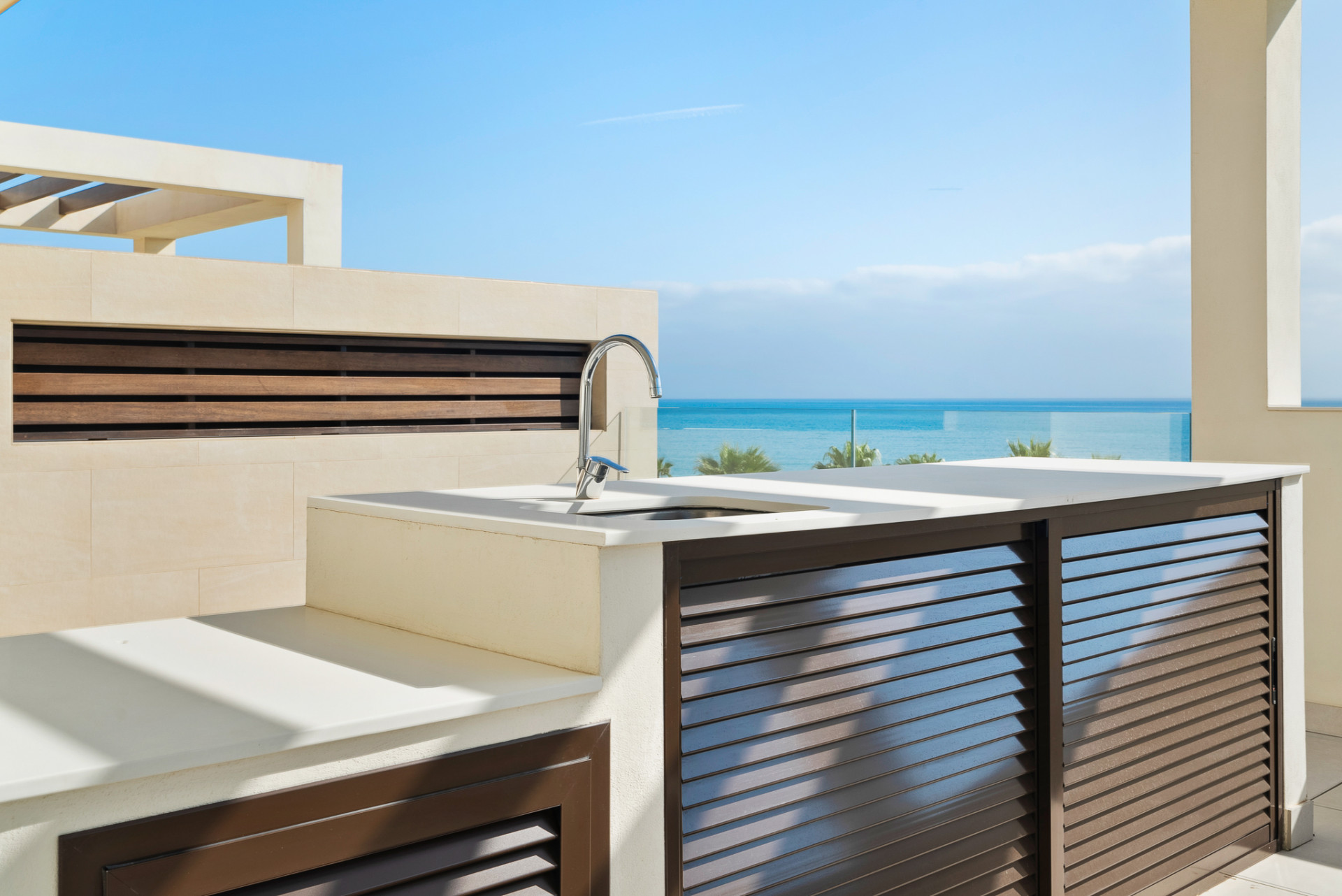 Welcome to a truly exceptional beachfront residence—a key-ready, luxury duplex penthouse in a prestigious, brand-new complex that defines coastal elegance. This expansive four-bedroom, four-bathroom penthouse is the only unit in the development that features a private, sparkling pool, creating a personal oasis with uninterrupted views of the Mediterranean. Every detail has been designed for sophistication and comfort: the open-plan kitchen seamlessly integrates with the spacious living area, all enhanced by floor-to-ceiling glass walls that capture panoramic, unobstructed sea views.