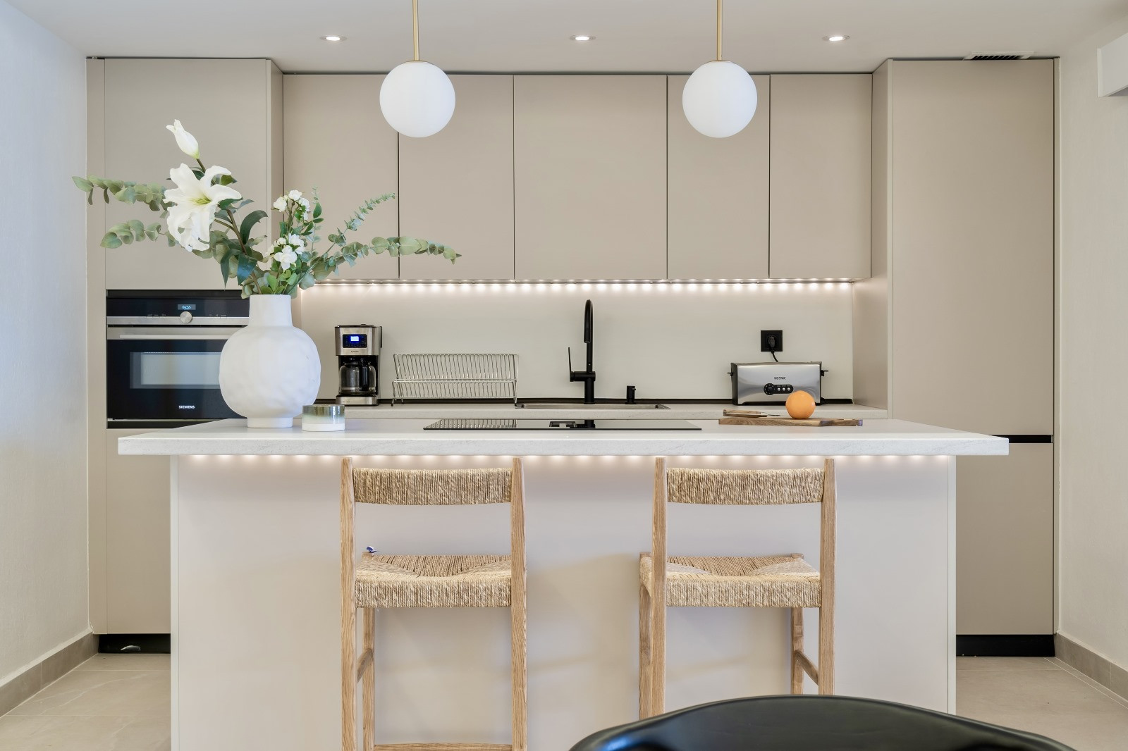 The apartment boasts a generous living area that flows seamlessly into the dining space and fully equipped kitchen, making it an ideal setting for both daily living and entertaining. High-end appliances, ample counter space, and modern finishes create a kitchen that is both functional and stylish.