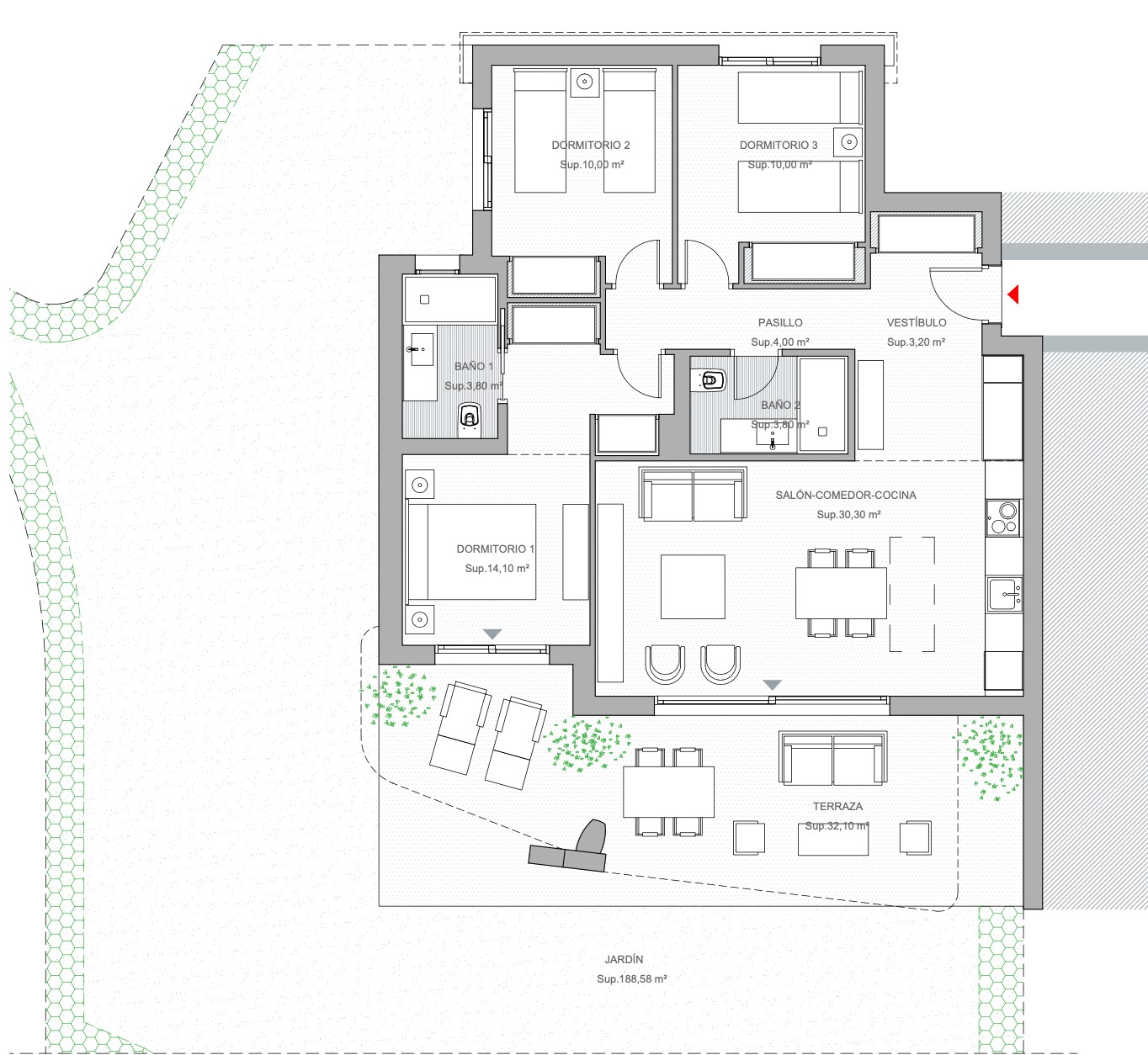 Designed for those who value space and privacy, the home features three bedrooms and two bathrooms, each finished with a modern aesthetic that balances style and functionality. The interiors open seamlessly to generous outdoor areas, where a 32 m² terrace extends into a beautifully landscaped 188 m² private garden, creating an ideal setting for alfresco dining, entertaining, or simply enjoying the sunshine.