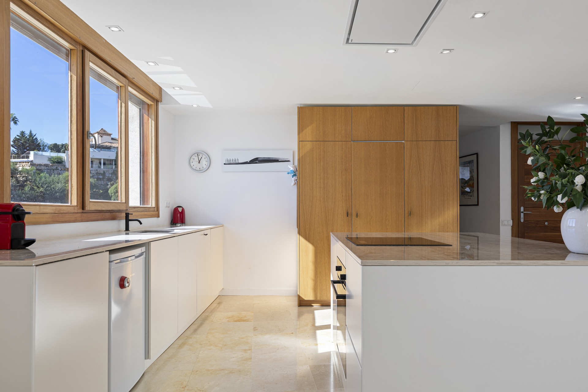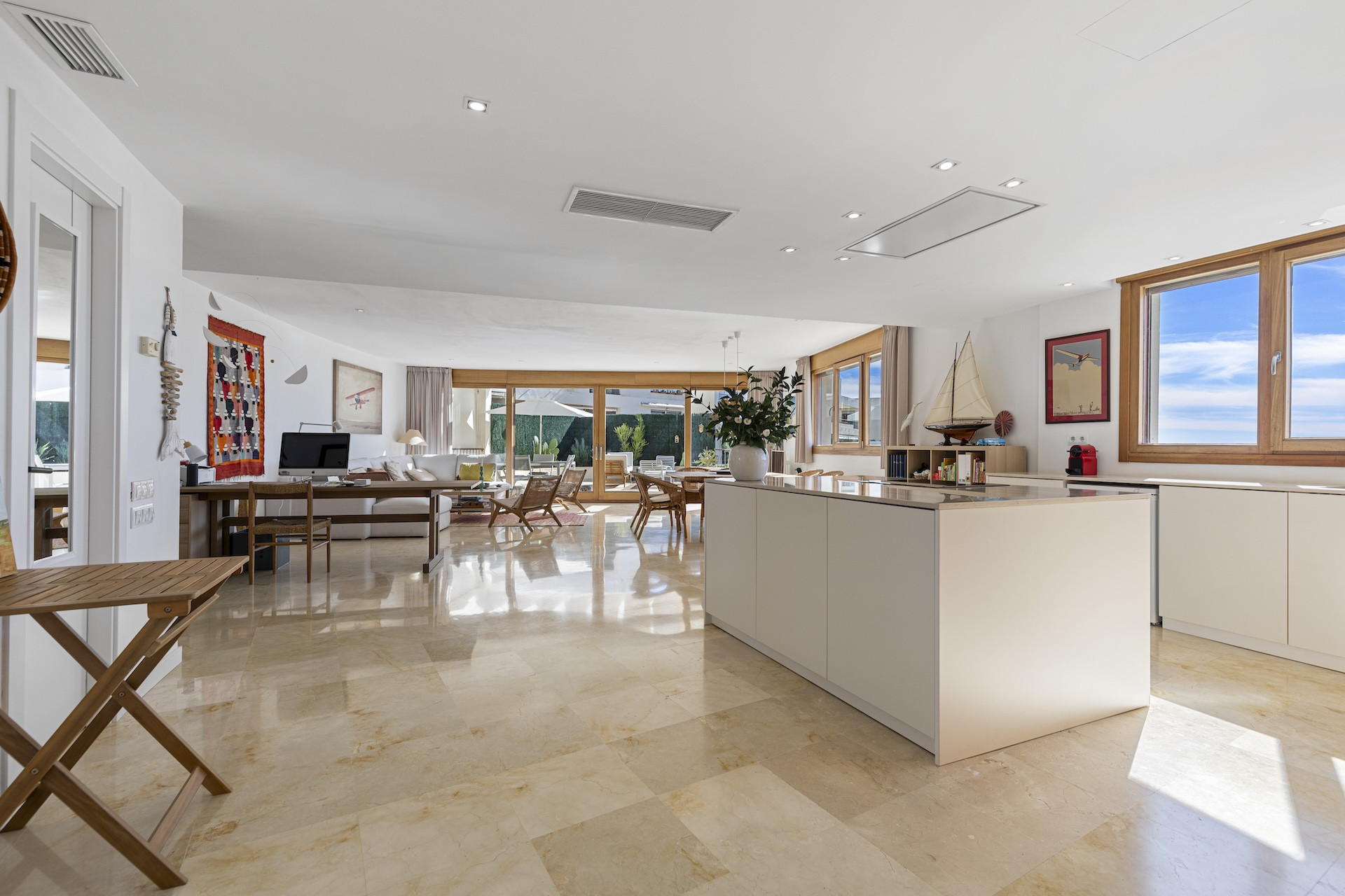 The modern kitchen flows seamlessly into the lounge and dining spaces, creating a calm and contemporary setting for daily living and effortless entertaining.
