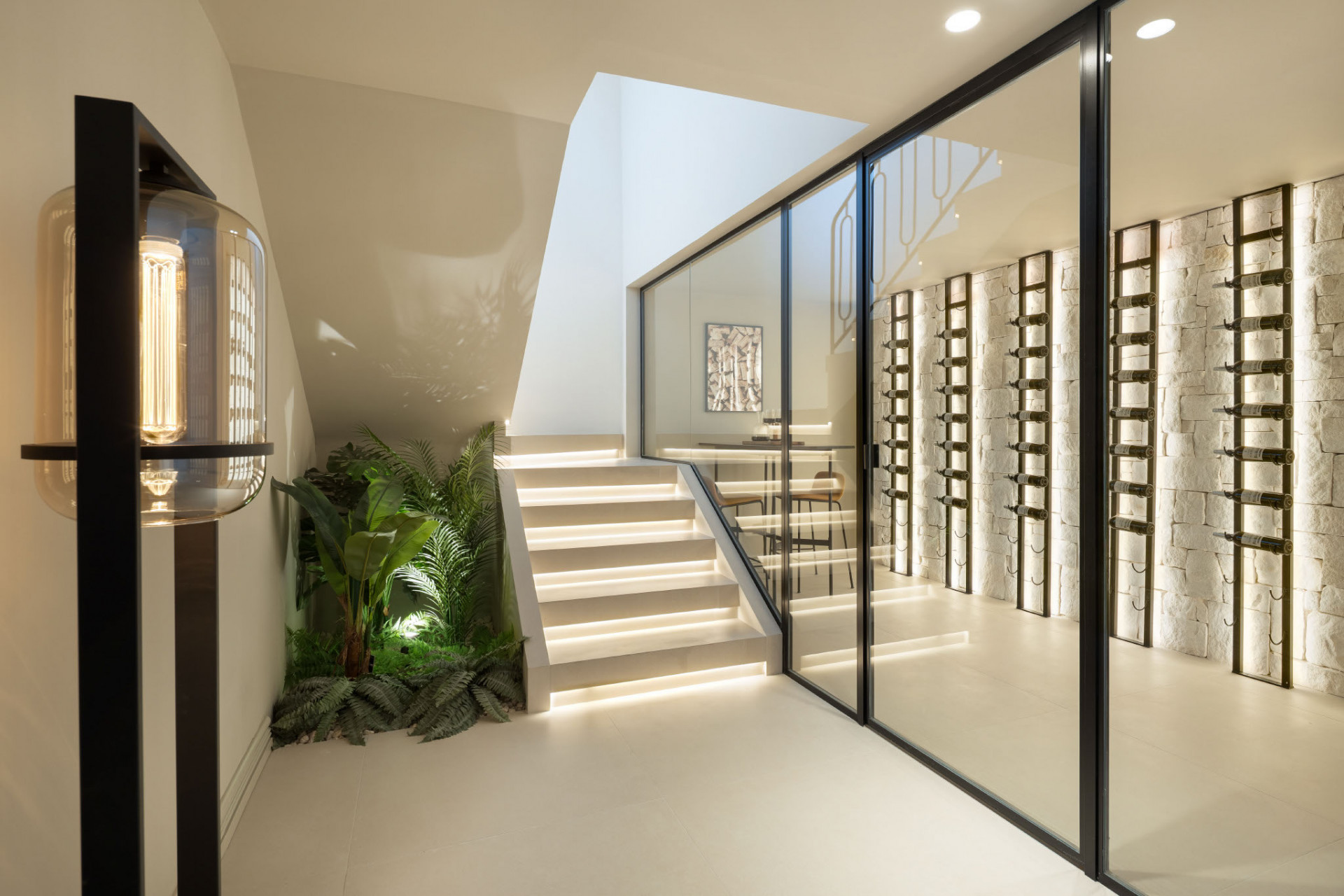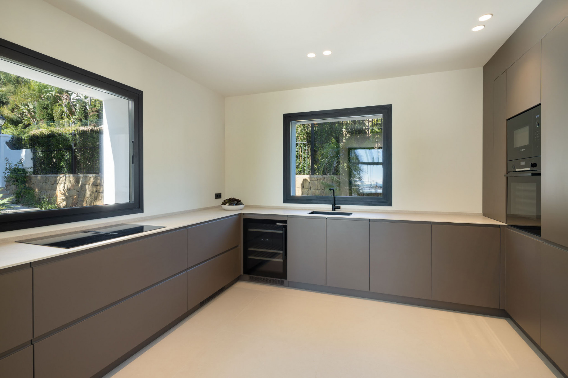 Life here is defined by effortless elegance and a strong connection to the landscape. Expansive floor-to-ceiling windows draw natural light into the spacious open-plan interiors, where indoor and outdoor living blend seamlessly. The main living area flows into a refined dining space and a modern Nordic-inspired kitchen equipped with premium Gaggenau appliances, complemented by a discreet preparation kitchen ideal for entertaining with ease.