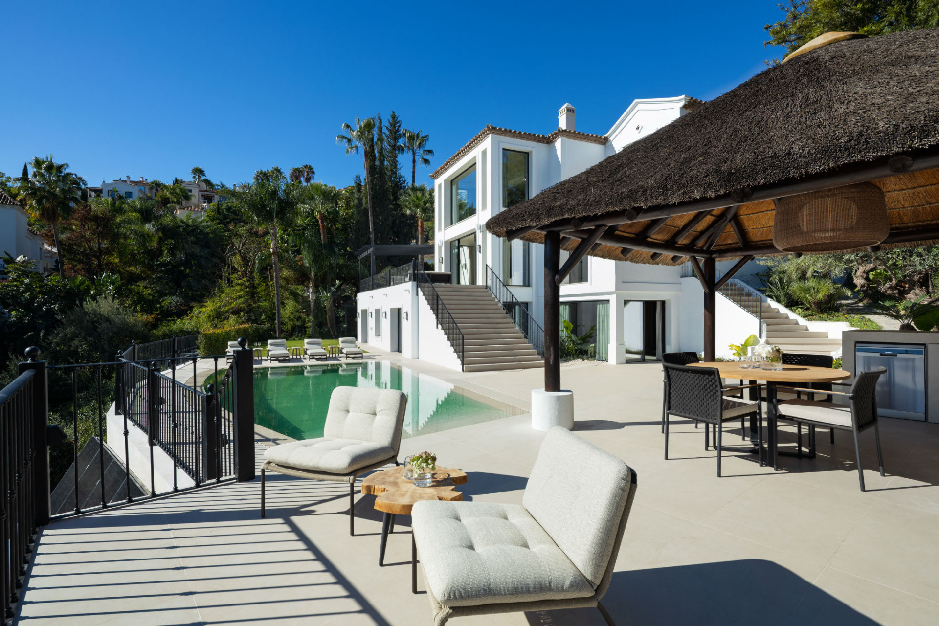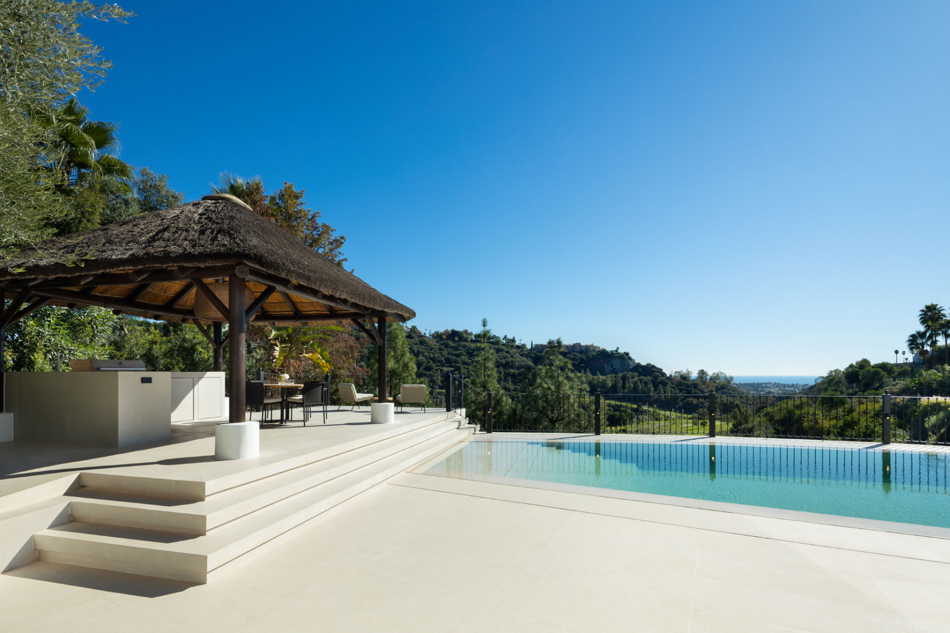 Outdoor living is equally impressive, with an infinity-style saltwater pool overlooking the golf course, landscaped garden areas, and a stylish cabana with outdoor kitchen designed for relaxed gatherings under the Mediterranean sky.