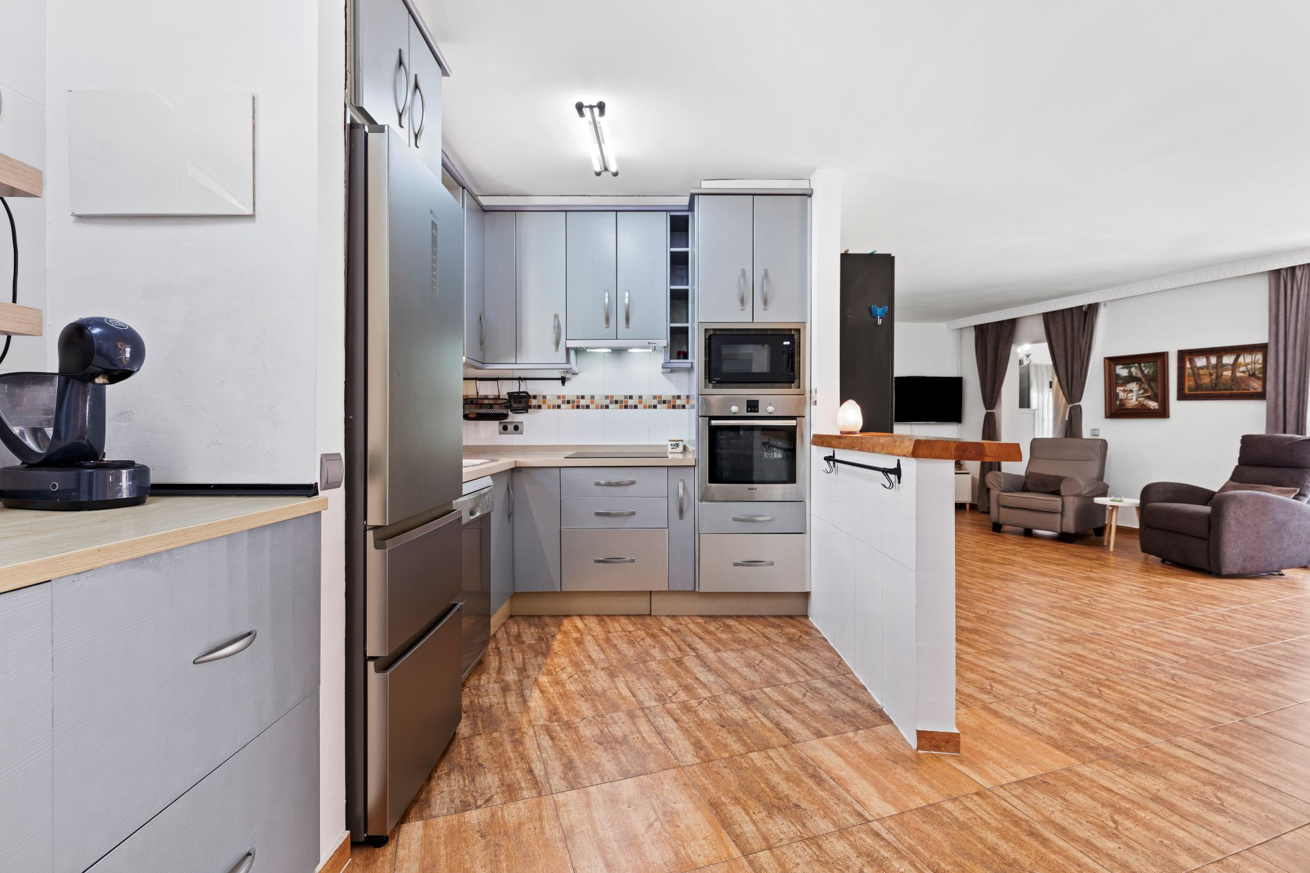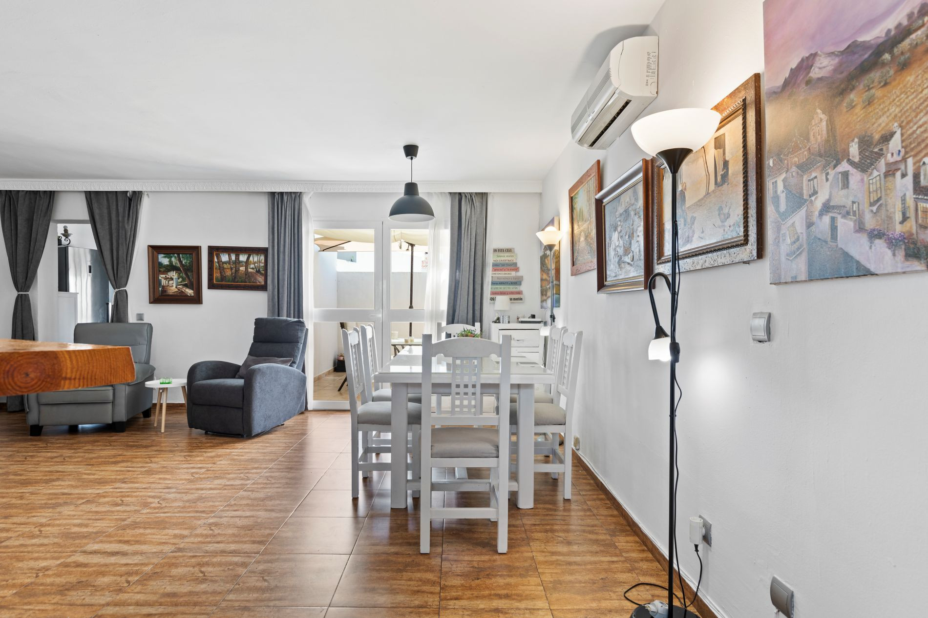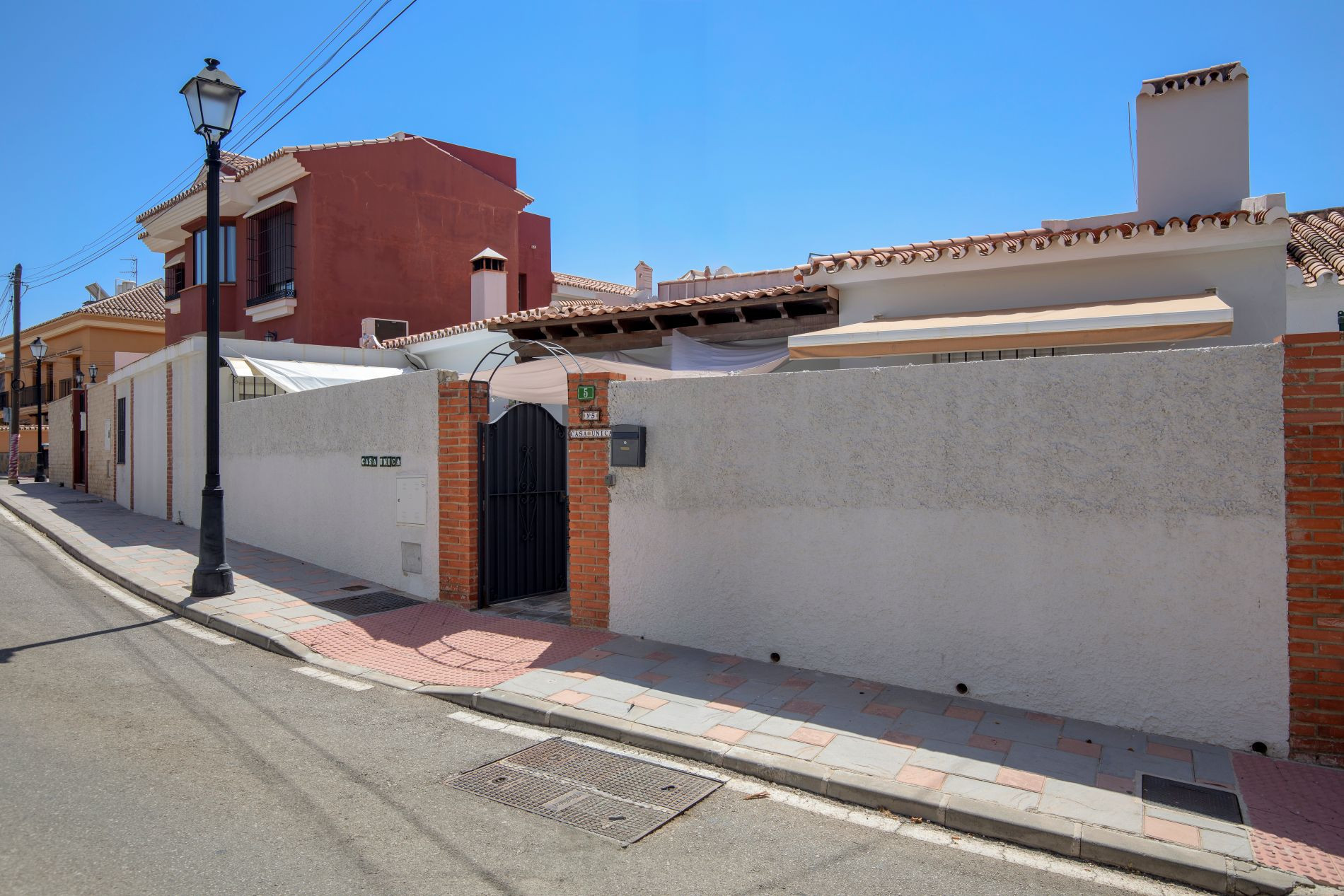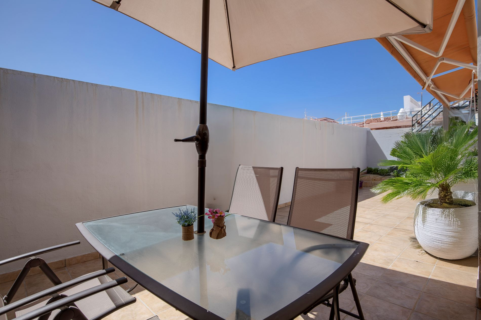 Recently renovated and fully adapted for accessibility, the villa ensures comfort and ease in every corner. Expansive front and rear patios invite outdoor living, whether for sun-soaked breakfasts, quiet afternoons reading, or relaxed family gatherings. The covered terrace with retractable awnings provides an ideal temperature year-round, creating an extension of the living space that embraces the Mediterranean climate.