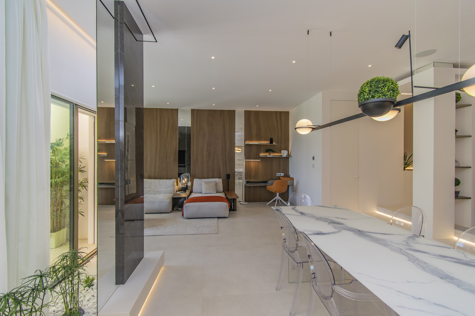 Set across three sophisticated levels, this stunning home has been upgraded to the highest standards, including a smart home system, underfloor heating by Agia, Airzone climate control, and premium materials throughout. The open-plan living area connects seamlessly to a modern designer kitchen and expansive terraces — ideal for entertaining or simply enjoying the tranquility of the Mediterranean. Fully furnished with exquisite taste, the home combines modern luxury with timeless comfort.