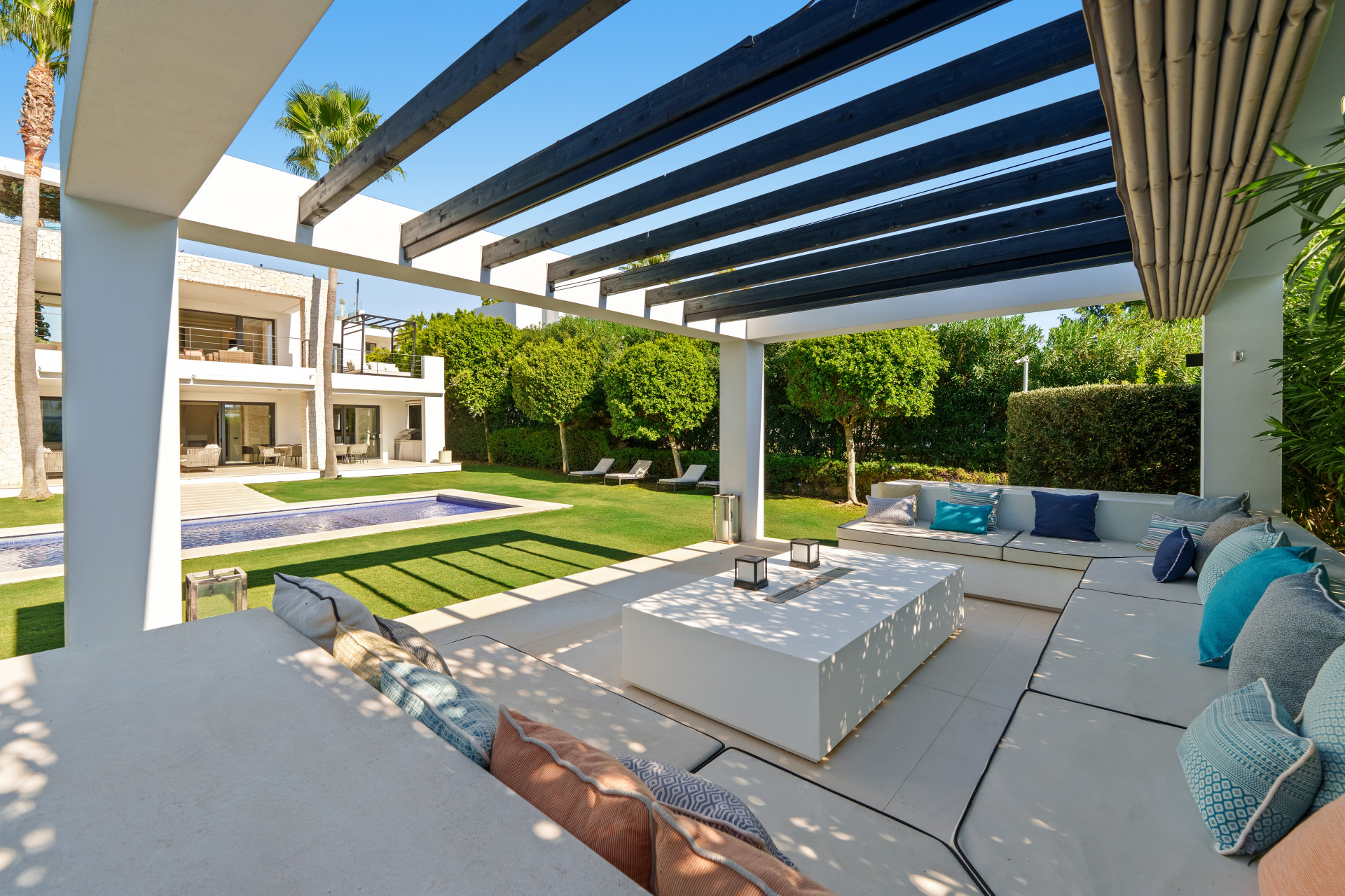 This striking contemporary villa is set within a secure, private community in Nueva Andalucía of just 15 homes, designed to combine modern elegance with effortless indoor-outdoor living. Surrounded by meticulously landscaped gardens, sculpted trees, and a shaded pergola lounge, the exterior spaces provide both privacy and serenity. A pristine pool, bordered by smooth stone tiles, forms a central feature, while a spacious upper terrace with a jacuzzi offers a perfect spot for outdoor relaxation and sun-soaked leisure.